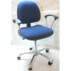 Krzesło ESD, ciemnoniebieskie, z materiału antystatycznego z podłokietnikami i metalowym podnóżkiem.